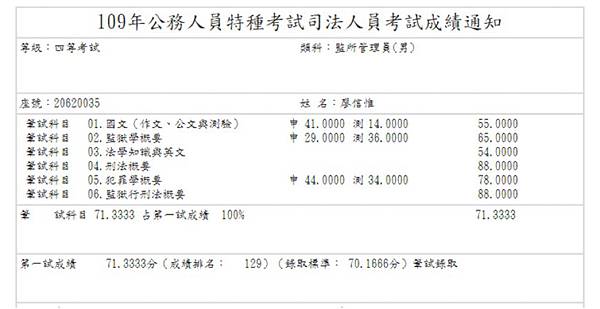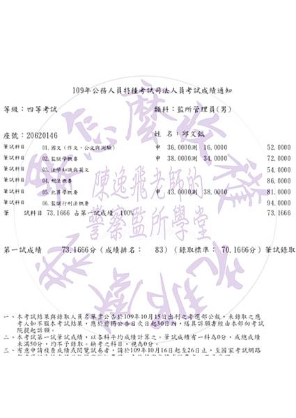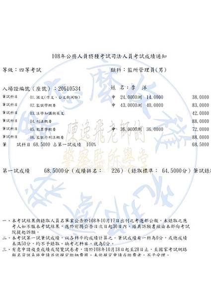 等級:四等考試類科:監所管理員姓名:李啟綸大家好,我畢業於北部某私立大學。退伍前即將加過此類科之司法特考,但因準備不足理所當然之落榜了,後來在網路上知道上榜考生如何準備國考,調整生活作息半工半讀一年,仍然以1分之差落榜於末代申論題之107年,但是今年因為陳老師之考試用書與精心準備之總複習講義,終於在108年上榜。