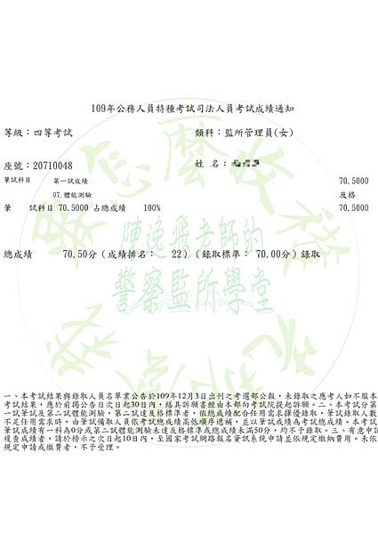 等級:四等考試類科:監所管理員姓名:張同學